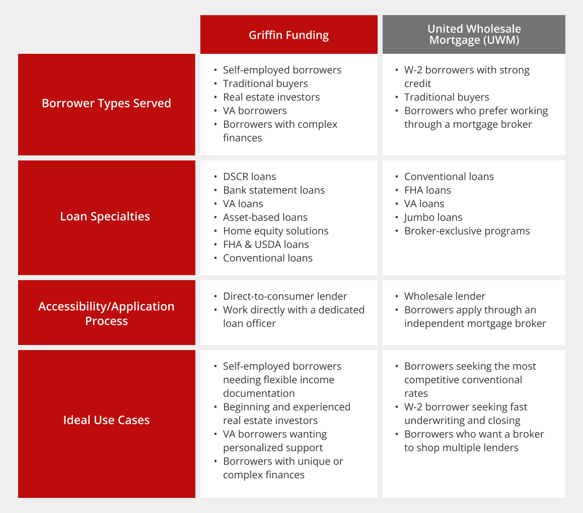 When deciding between Griffin Funding and UWM, the best choice depends on your income type, loan goals, and how much guidance you want during the process.