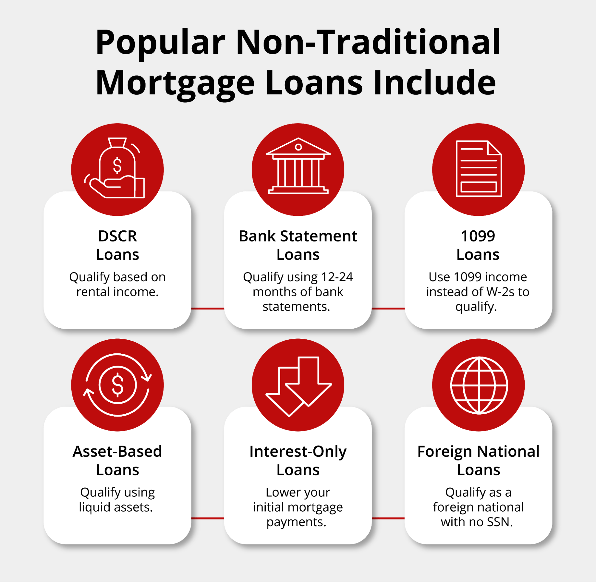 Non-traditional mortgages come in several forms, each designed for different borrower situations. Each type has unique qualification criteria that can help you secure financing when conventional loans won’t work. The types of non-traditional mortgage products include:Â