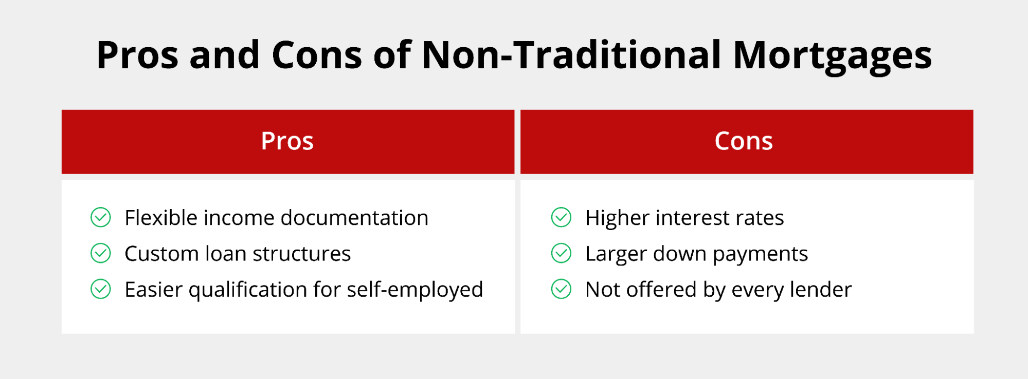 While non-traditional mortgages offer flexibility, they come with some trade-offs you should consider. The potential cons of non-traditional mortgages include: