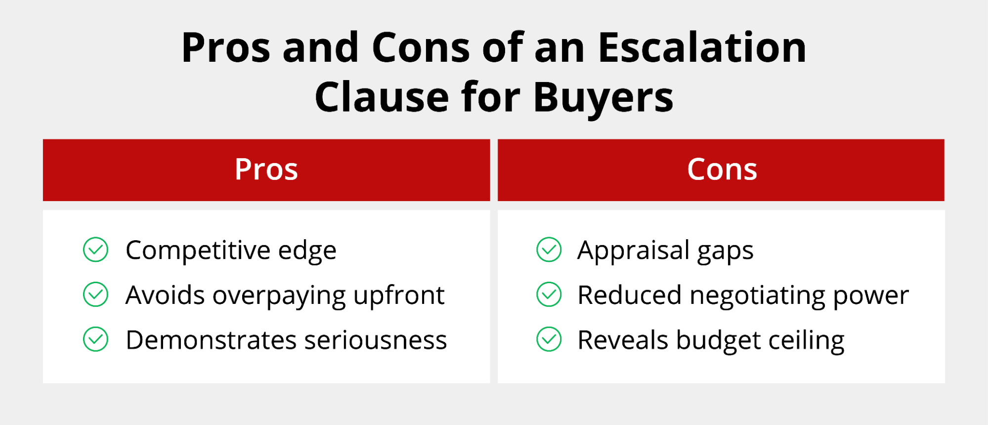 Before adding an escalation clause to your offer, you’ll want to weigh the advantages against the potential drawbacks. Here’s what buyers and sellers should consider:
