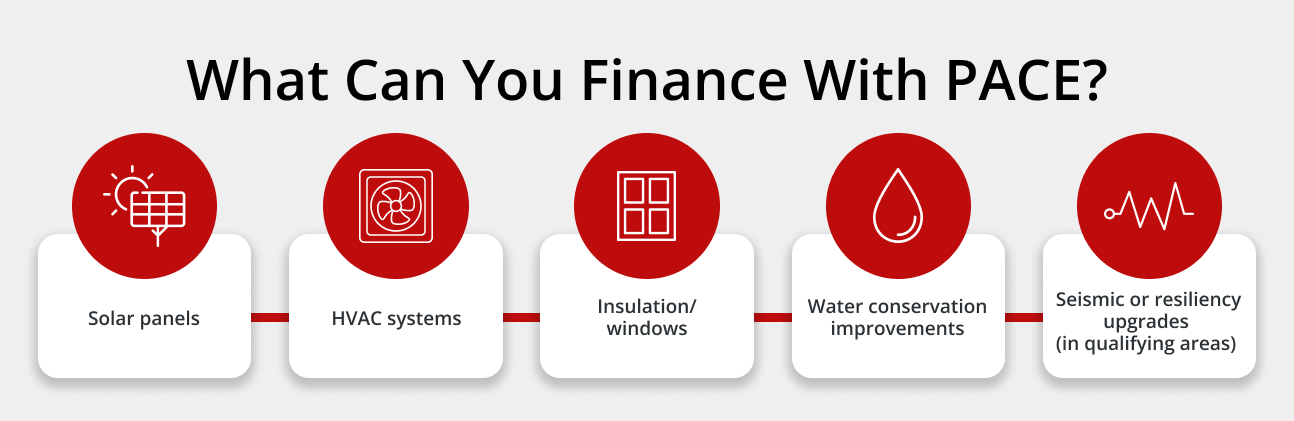 PACE financing can be used for a wide range of upgrades that improve a property’s energy efficiency, sustainability, or resilience, offering an alternative to using cash or trying to refinance for home improvements.